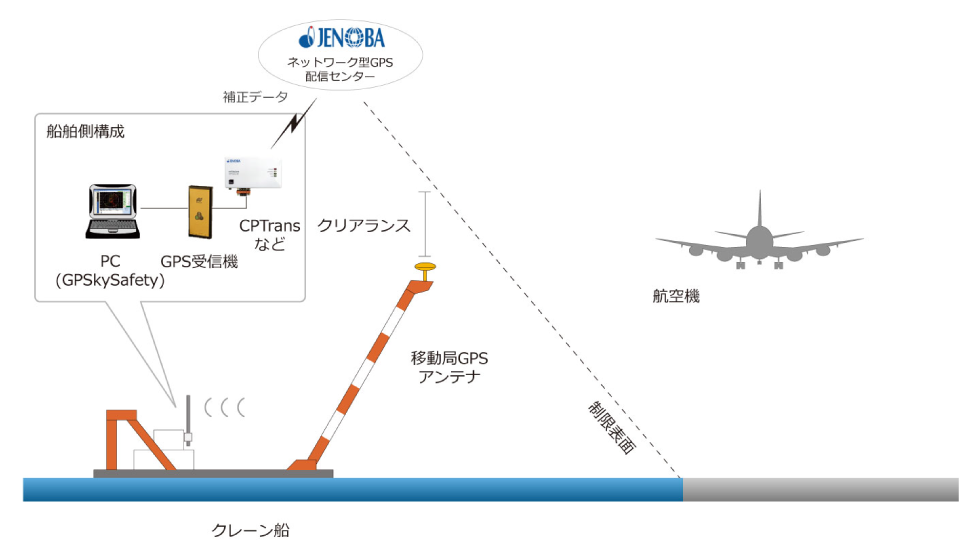 GPSkySafety(ジーピースカイセーフティ)は、高精度なRTK-GNSSを利用し、安全にクレーン船工事を行なうためのシステムです。クレーン船(もしくは工事用起重機)の先端部に設置されたGNSSアンテナ位置と、設定された制限表面との距離をリアルタイムに自動計算します。