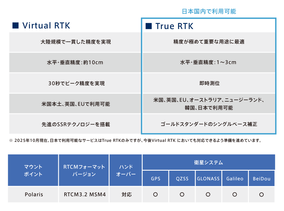 ※ 2025年10月現在、日本で利用可能なサービスはTrue RTKのみですが、今後Virtual RTK においても対応できるよう準備を進めています。